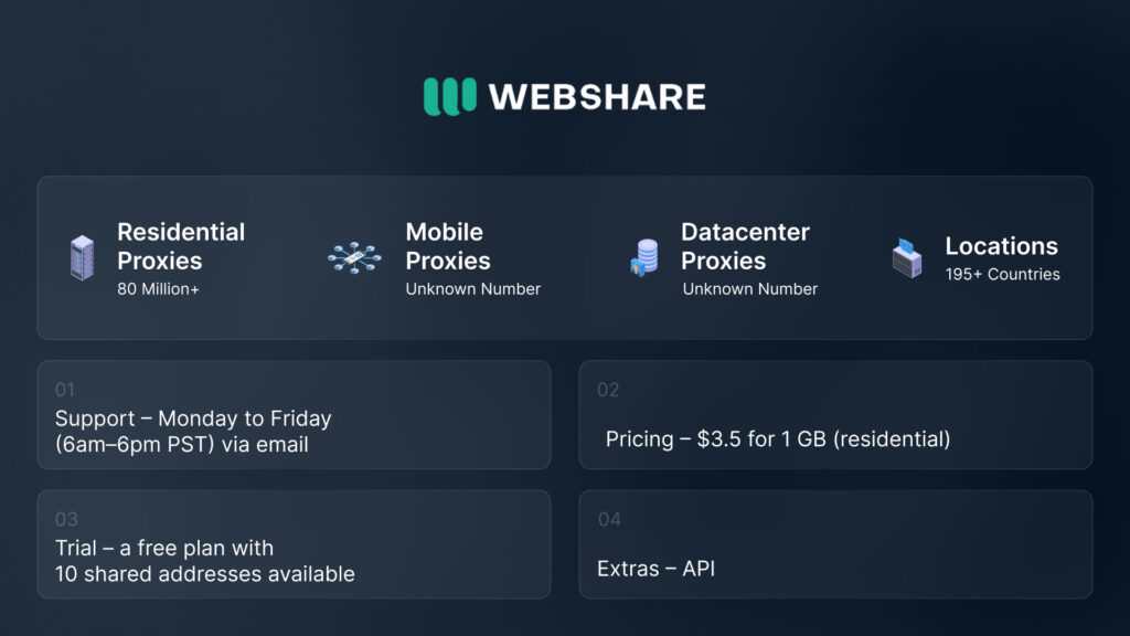 Webshare’s strong infrastructure makes it stand out in the market. Its datacenter and ISP proxies are fast and stable. you’re offered a complete self-service – it gives you full control over your subscription.