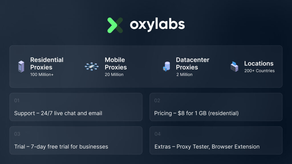 Oxylabs is the best choice if you’re looking for premium SOCKS5 proxies. The provider supports SOCKS5 protocol with residential, mobile, dedicated datacenter, and semi-dedicated ISP proxies, so you can choose the one that best suits your project.