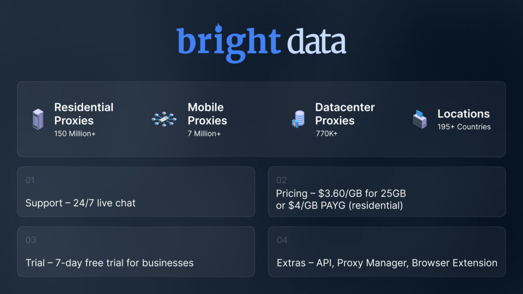 Bright Data’s pricing is very flexible: you can choose a monthly plan or PAYG. some features will cost you extra, though.