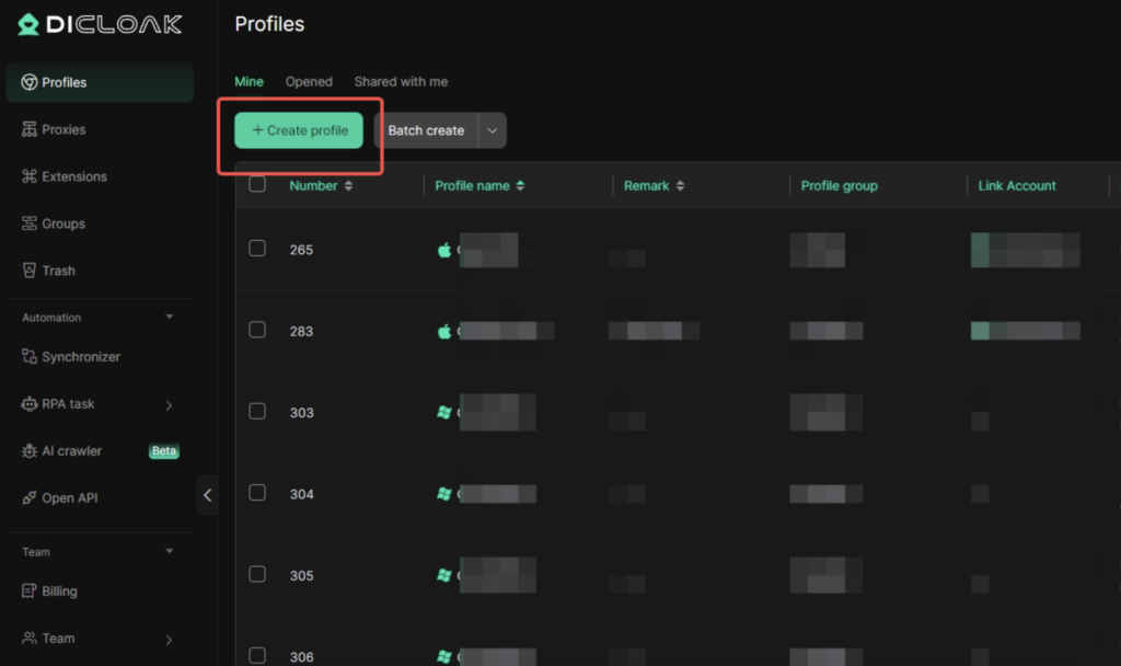 Each profile in DICloak Antidetect Browser runs in its own isolated browser profile with a unique digital fingerprint, like a separate IP address, screen resolution, or device setup.