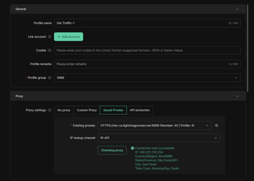 - Fill in the basic profile details like name, remark, and group. Set up a proxy, then tap “Checking Proxy” to verify the connection and location.