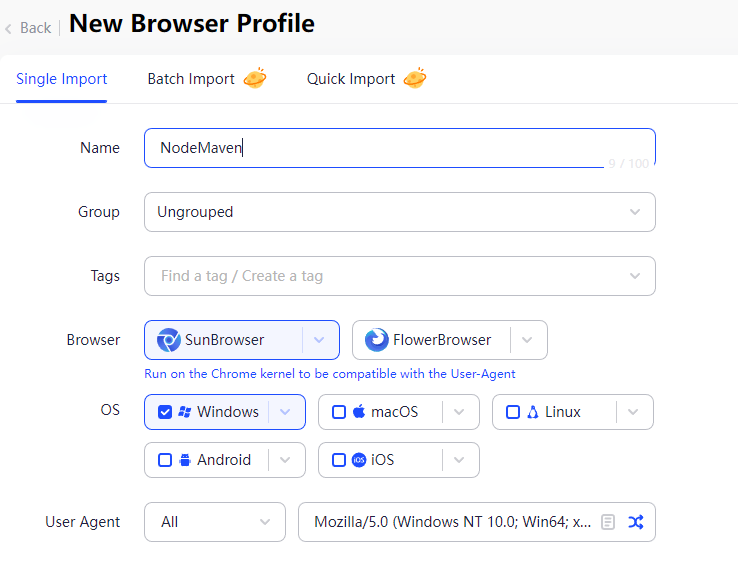 2. Next, set the browser profile name. For the Browser, you can choose more options by simply clicking the “dropdown button” beside the SunBrowser/FlowerBrowser.