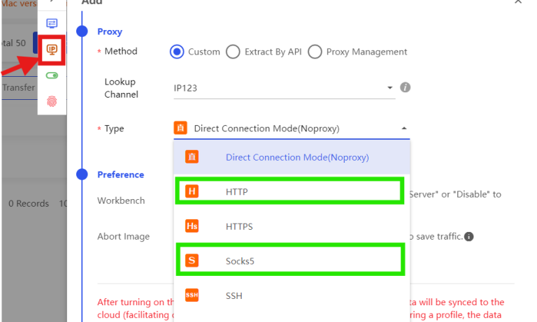 3. After this you can scroll down or use the small icon menu to the left of the window to select the Proxy section. Once there you will select the type of protocol you need to use with your proxies. We currently offer the HTTP or SOCKS 5 options.