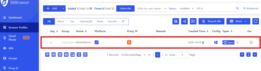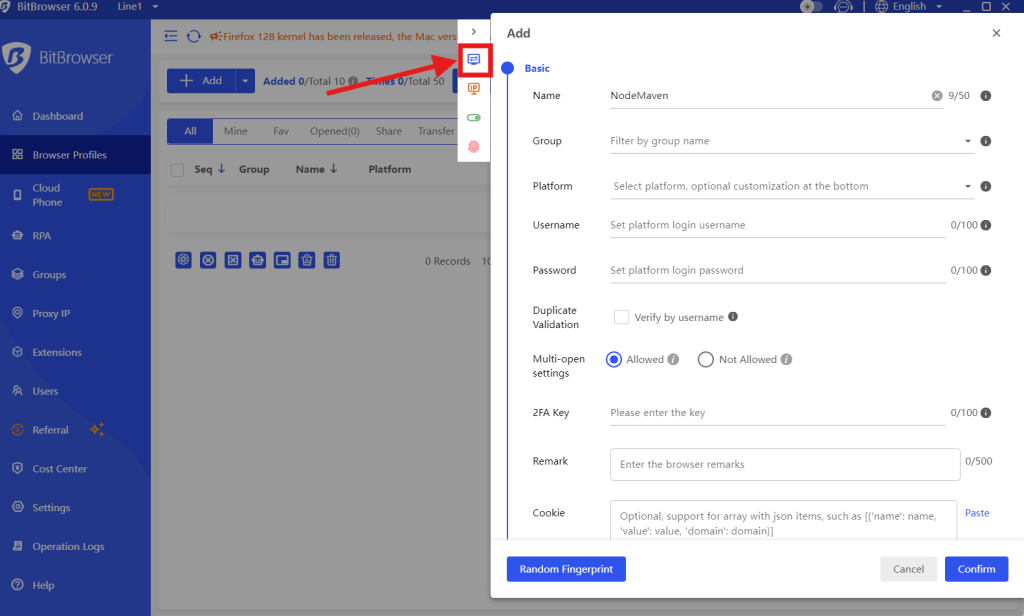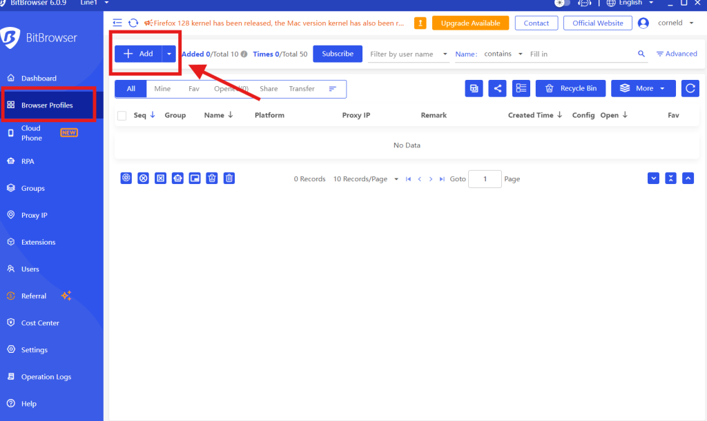 To begin using our proxies with BitBrowser, navigate to the Browser Profiles section and click “Add” in the upper-left corner of the menu to create a new browser profile.