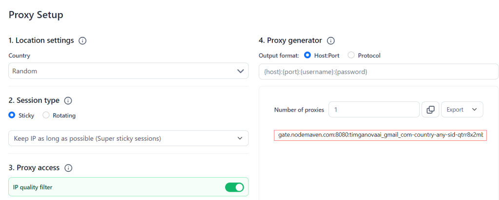 You don’t need to manually type in the proxy details ( Host, Port, Username, Password ) in Dolphin Anty settings. The proxies in Nodemaven are arranged with a format that is accepted by Dolphin Anty, which is host:port:login:password. After choosing all the details that you need like Country/Region/City and Session type etc. Simply copy the proxy details (highlighted in red) then paste them into Proxy section of Dolphin Anty settings.