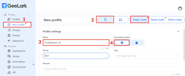 2. To create a new profile in GeeLark, click “New Profile,” select “Single Create,” name your profile, and choose your phone’s operating system.