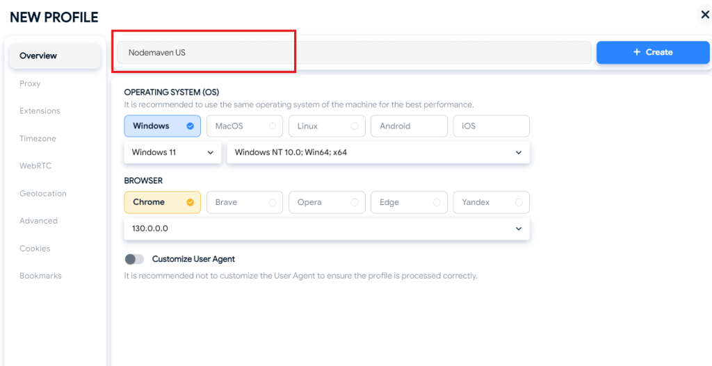 5. Complete the setup by clicking the “Create” button. Your profile is now ready for use.