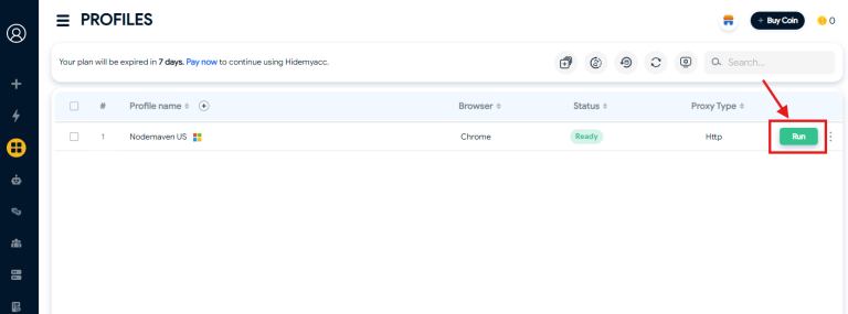 Your HideMyAcc profile is ready to use with your NodeMaven proxy; simply click the Run button to open it.