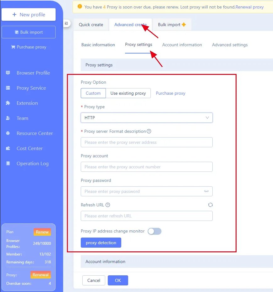 3. Click “Advanced create”, select the HTTP proxy, and set the proxy manually: