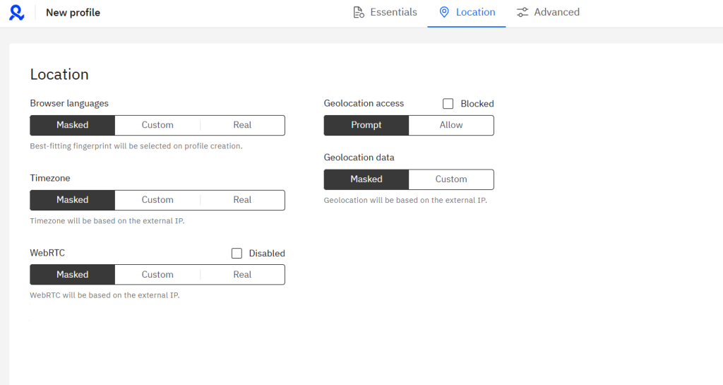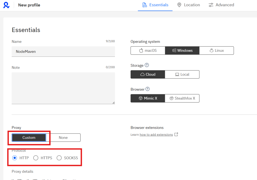 3. Proceed to “Location & Proxy”, then choose HTTP or SOCKS 5 for Proxy type.