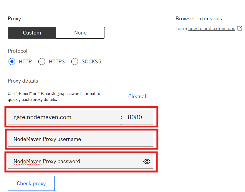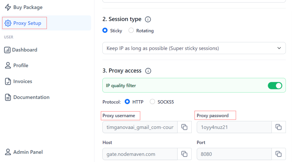 4. If you haven’t yet got the proxy details, you can find your Proxy username and Proxy Password in the NodeMaven Proxy Setup section.