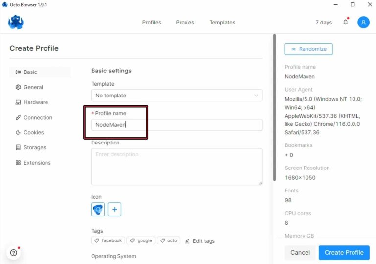 4. Set your profile name. You can also customize your profile with a lot of options, including software parameters, hardware, cookies, and user agents.