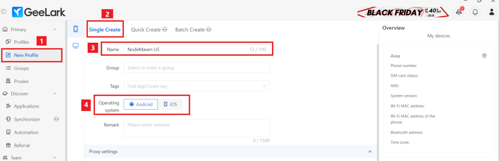 Вы можете скачать GeeLark от HERE. Чтобы начать использовать наши прокси с GeeLark, вам нужно создать новый профиль.