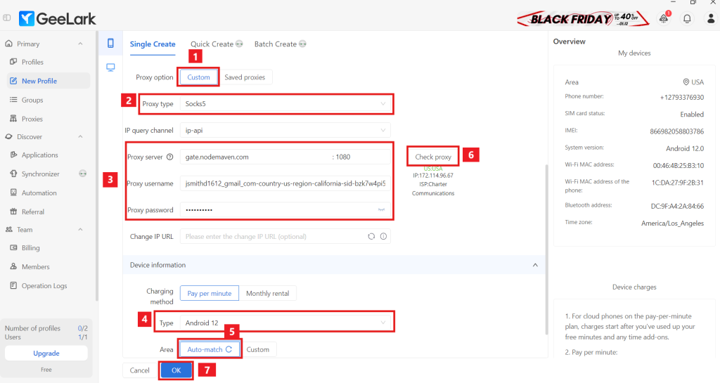 3. Для настройки профиля в GeeLark, выберите опцию Custom и выберите нужный протокол для ваших прокси (HTTP или SOCKS5). Вы можете вставить строку прокси-сервера NodeMaven или вручную заполнить информацию. В разделе Type выберите версию виртуального телефона ОС, а также в разделе Area либо определить местоположение вашего облачного телефона автоматически по IP, либо вручную выбрать местоположение. Далее, проверьте ваш прокси и в результате отобразится прокси-сервер, прокси-IP и Интернет-провайдер прокси-сервера. После успеха нажмите OK для завершения и активации вашего профиля.