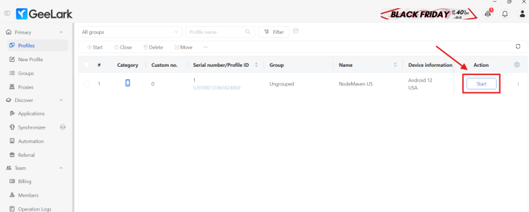 4. Ваш профиль GeeLark создан и готов к использованию с вашим прокси-сервером NodeMaven. Чтобы открыть свой профиль, просто нажмите на кнопку Начать.